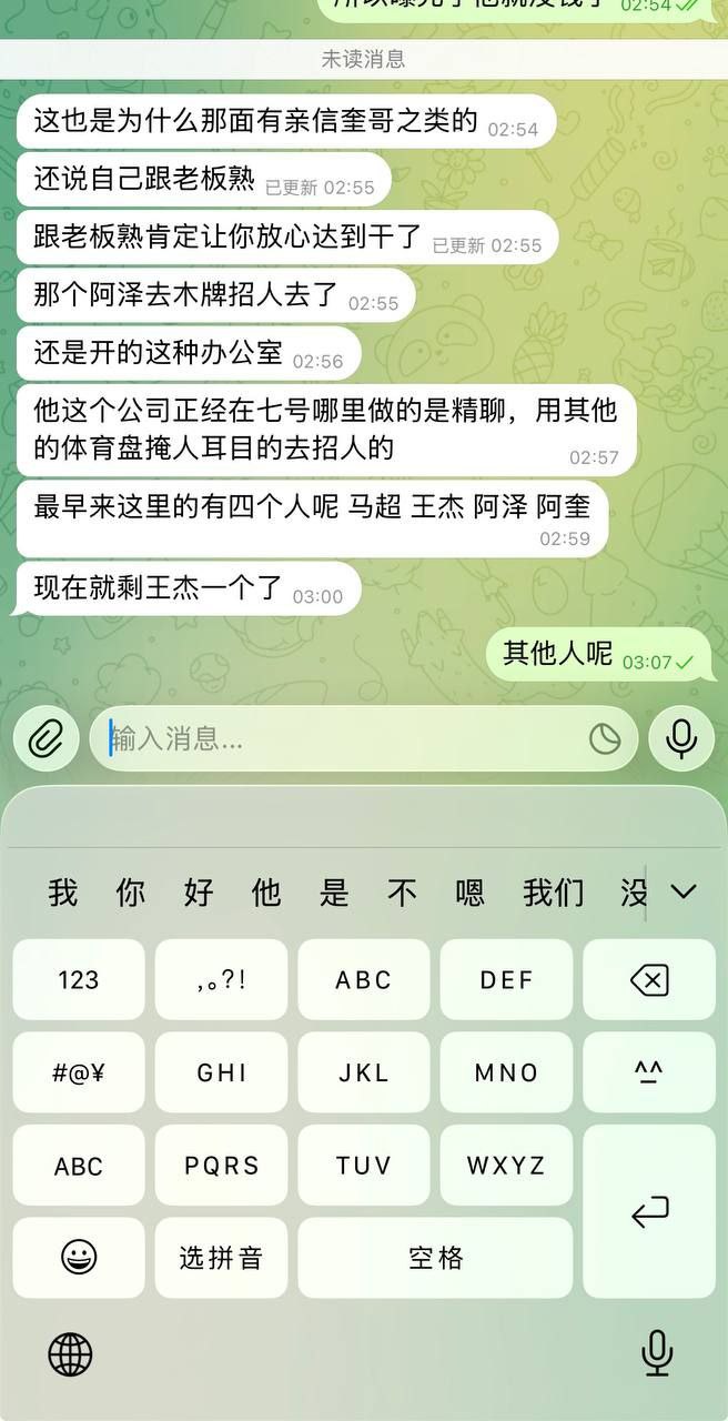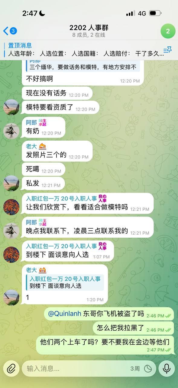 公司说我“触碰红线”把我踢群,简直可笑!如果他们没鬼,为什么要派人守在我住的酒店楼下威胁我,说要我死?如果是误会,为什么不敢当面解决?他们每天给员工洗脑说磅湛多好,可那里明明是柬埔寨和越南边境的北海30、31、32栋别墅区,就是个坑!