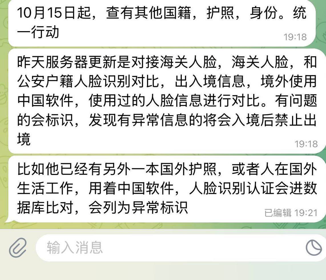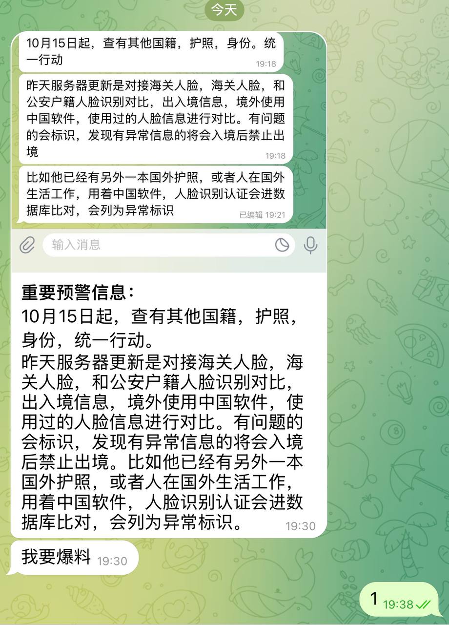 昨天服务器更新是对接海关人脸,海关人脸,和公安户籍人脸识别对比,出入境信息,境外使用中国软件,使用过的人脸信息进行对比。有问题的会标识,发现有异常信息的将会入境后禁止出境。