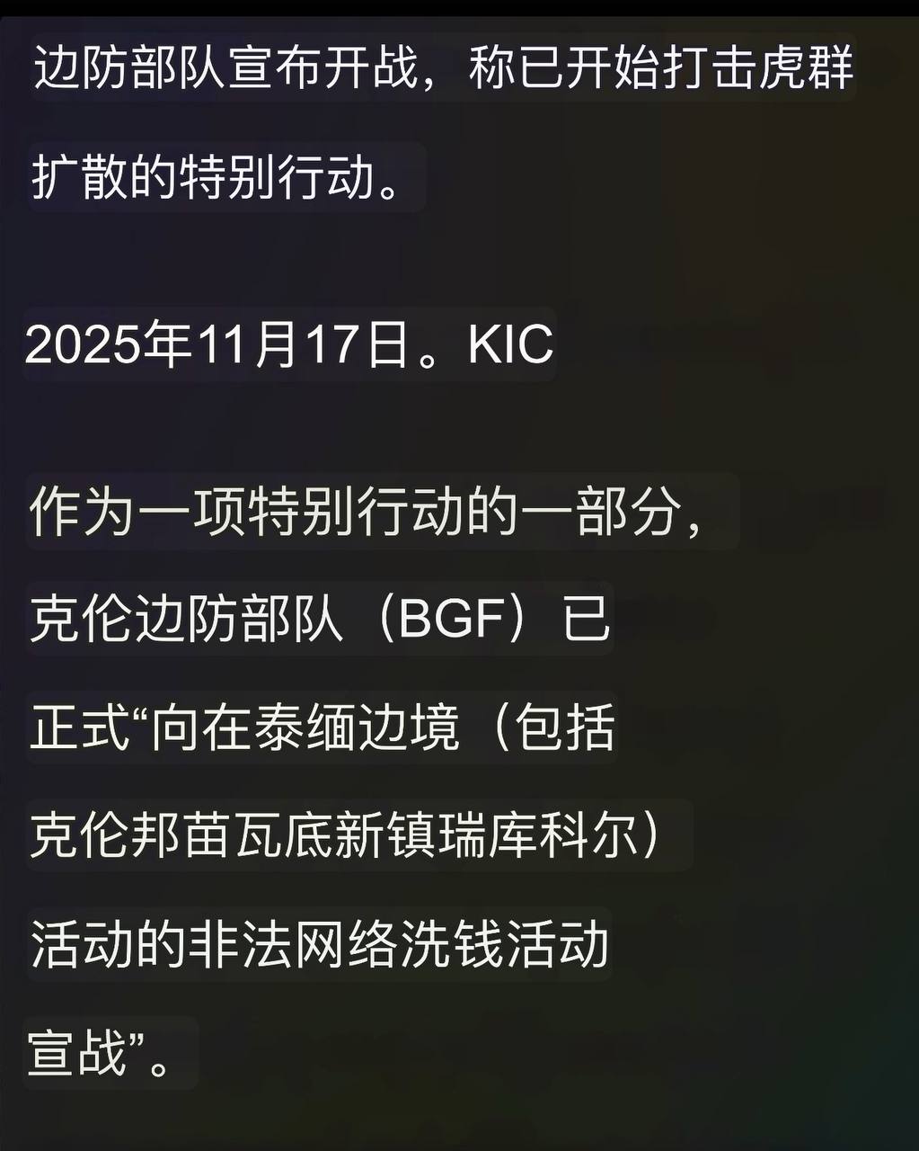 缅甸重磅:刚刚官方发的新闻,边防军宣布启动大规模“扫荡诈骗园区”的特别军事行动 发布时间:2025年11月18日 浏览量:22 阅读时间:1分钟 分类:诈骗新闻 妙瓦低城,包括水沟谷新城在内的泰缅边境一带,长期聚集着以网络诈骗为主的地下“杀猪盘”犯罪园区。 克伦边防军正式发布“军事声明”称,将针对这些非法线上诈骗组织展开一次特别军事行动,并将予以强力清剿。