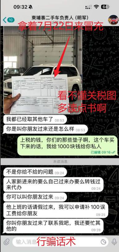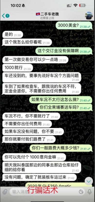 有网友爆料称,在飞机上被所谓“进口车行”诈骗 4000美金。骗子以“低价进口车”名义发布广告,谎称车辆从泰国运往柬埔寨波贝,诱导受害者先支付“订金”和“关税代办费”。
